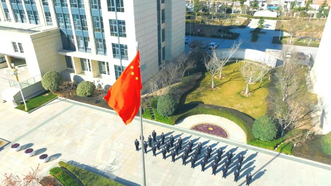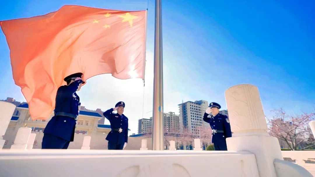 3名升旗手警容严整、气势勃发,迈着铿锵有力的步伐护卫国旗来到旗杆下,国歌响起,五星红旗冉冉升起。全体司法警察庄重肃立,面向国旗庄严敬礼、高唱国歌,胸前的警徽在朝阳下熠熠生辉。